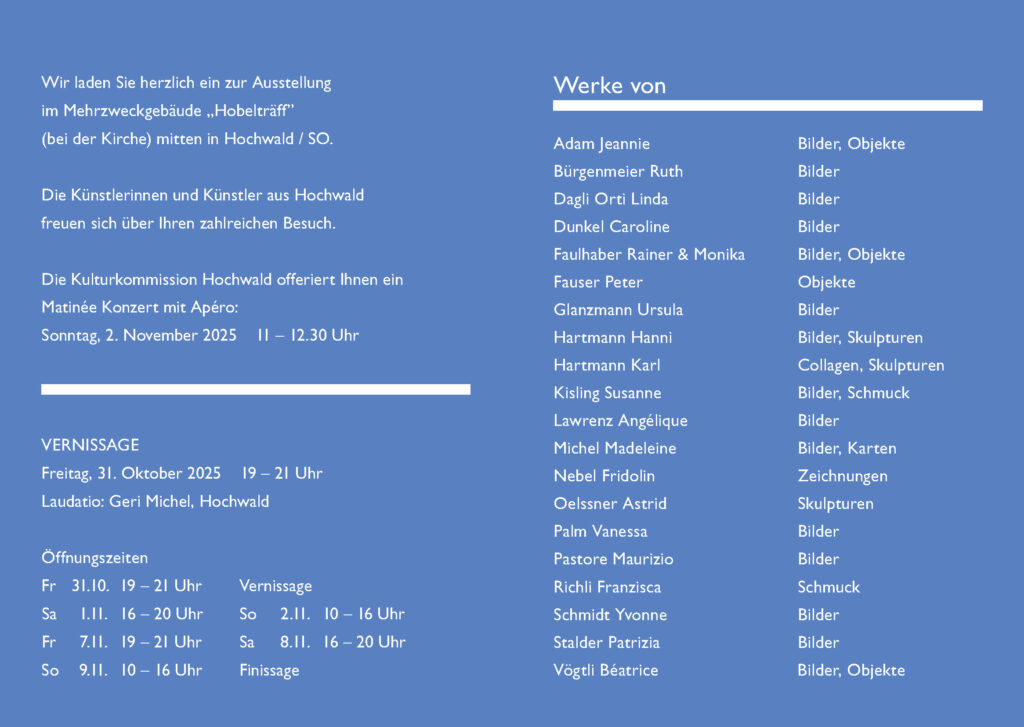 Die Künstlerinnen und Künstler aus Hochwald freuen sich über Ihren zahlreichen Besuch.